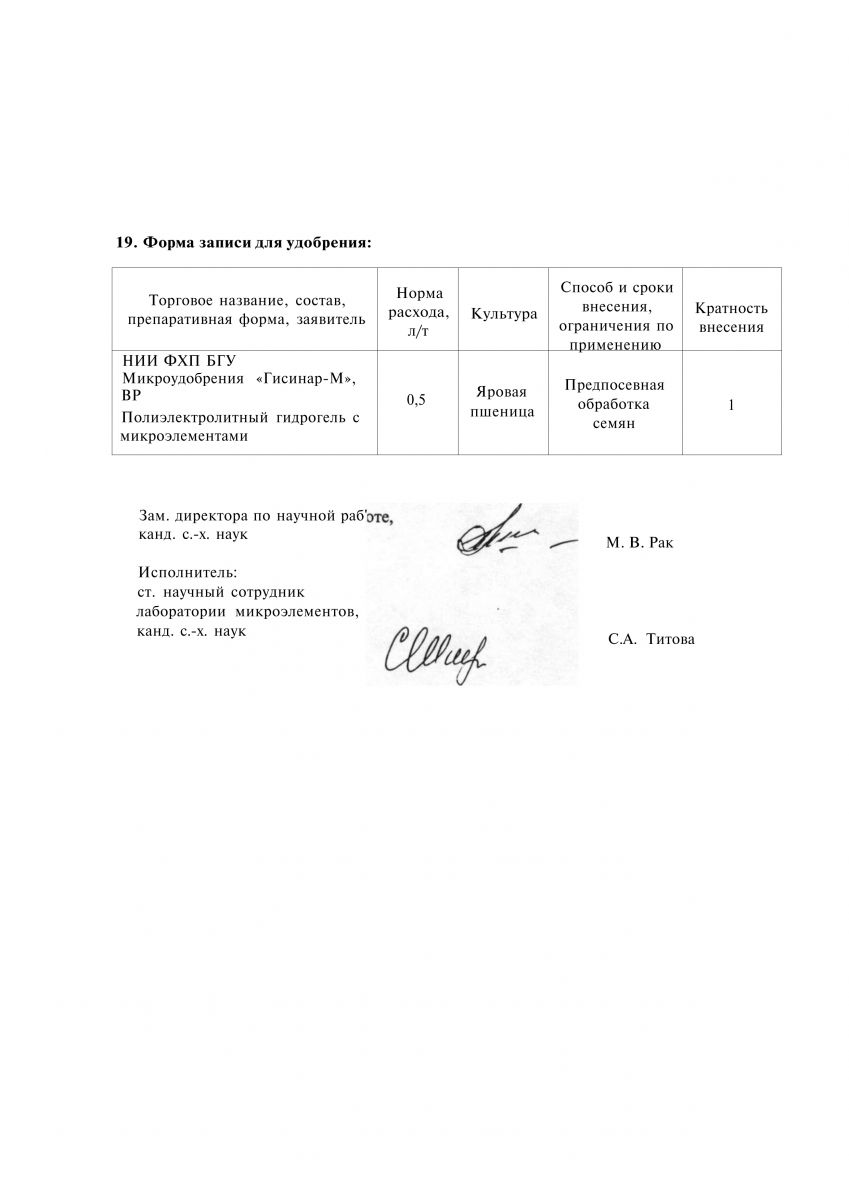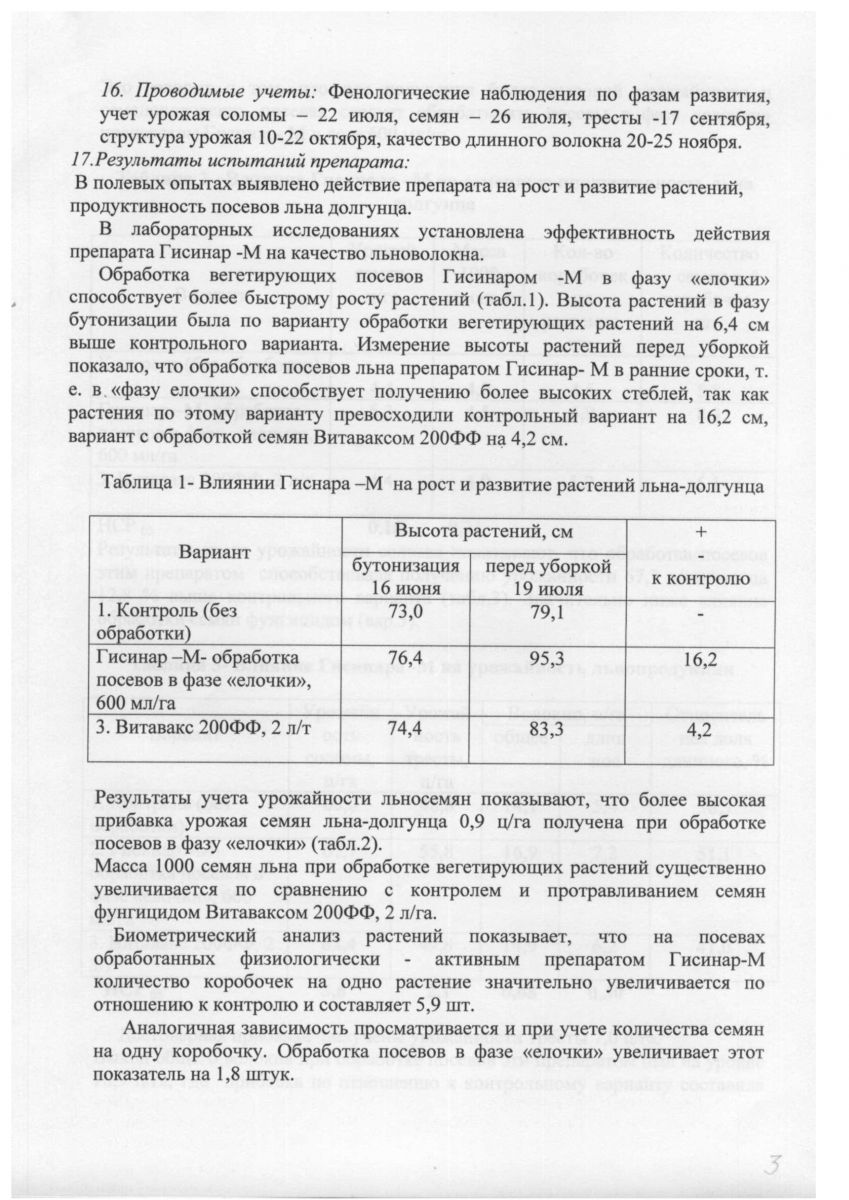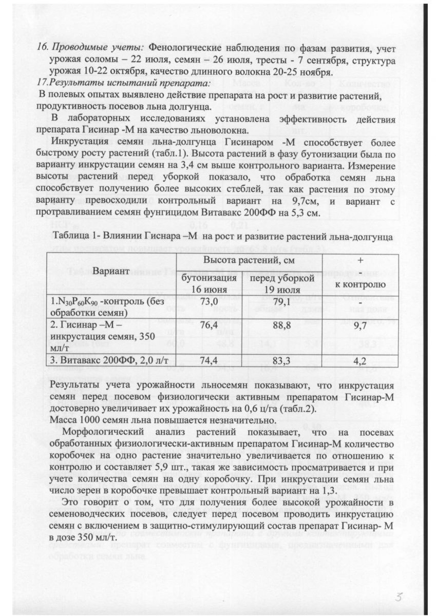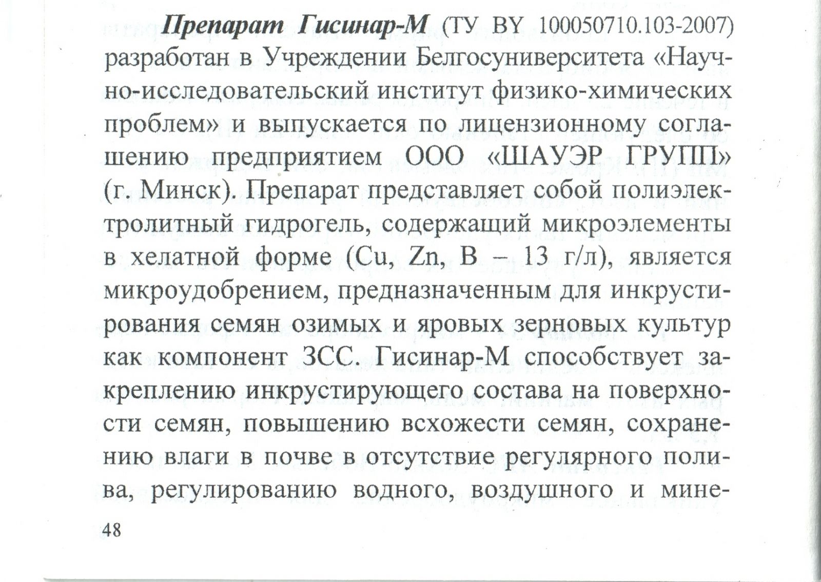 Препарат Гисинар-М представляет собой полиэлектролитный гидрогель, содержащий микроэлементы в хелатной и органо-минеральной формах в г/л: Cu-13, Zn-13, B-13, N-37,17, MgO-12,96) и является микроудобрением, предназначенным для инкрустации семян озимых и яровых зерновых культур и семян льна, а также для подкормок льна в период вегетации (обработка в фазу "ёлочки"). Гисинар-М способствует закреплению инкрустирующего состава на поверхности семян, повышает их всхожесть, регулирует водный, воздушный и минеральный режим питания растений.