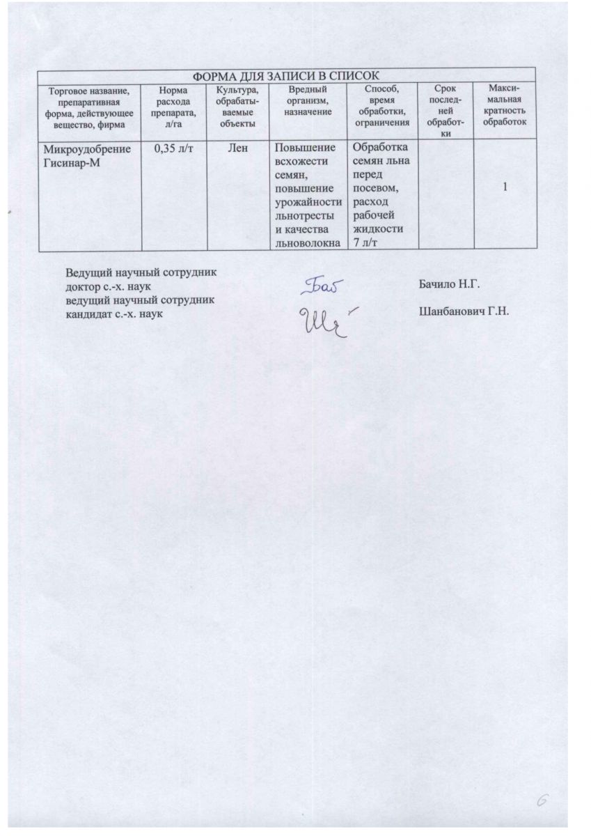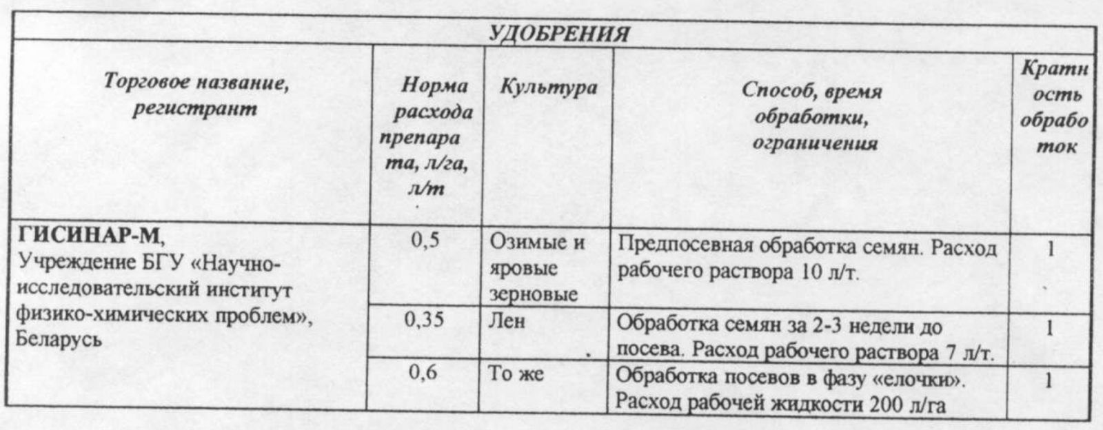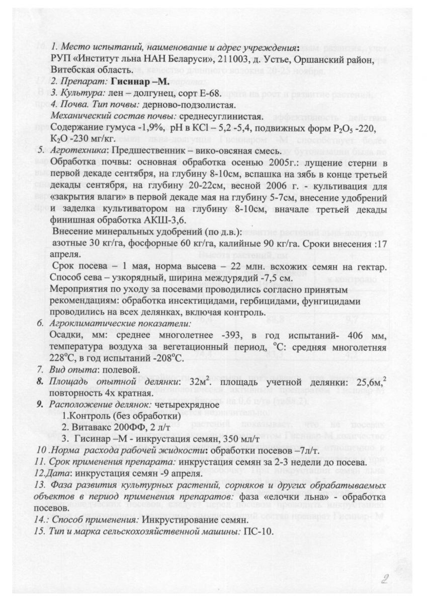 Гисинар-М с 2006г включен в государственный реестр и внесен в Каталог пестицидов и удобрений, разрешенных для применения на территории Республики Беларусь. Инкрустирование семян осуществляется на стационарном, серийно выпускаемом оборудовании.