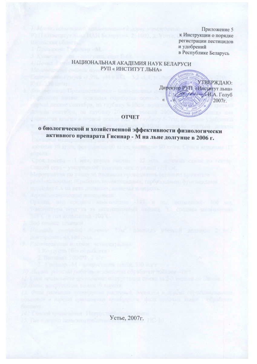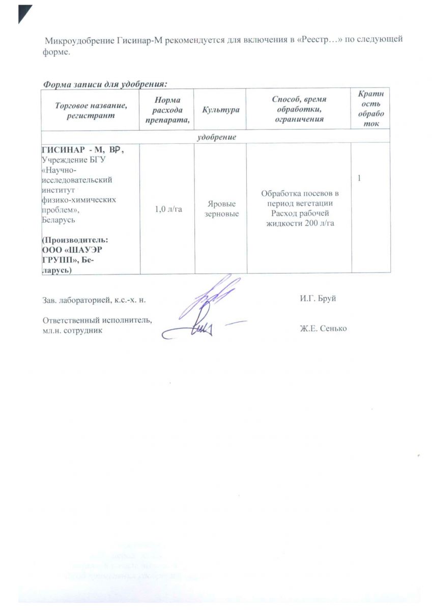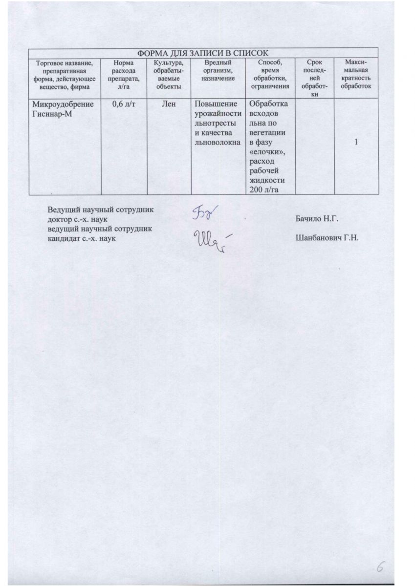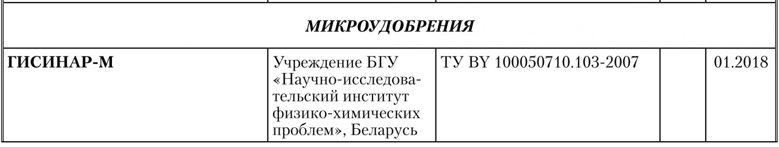 Гисинар-М с 2006г включен в государственный реестр и внесен в Каталог пестицидов и удобрений, разрешенных для применения на территории Республики Беларусь. Инкрустирование семян осуществляется на стационарном, серийно выпускаемом оборудовании.