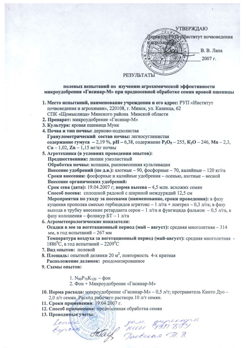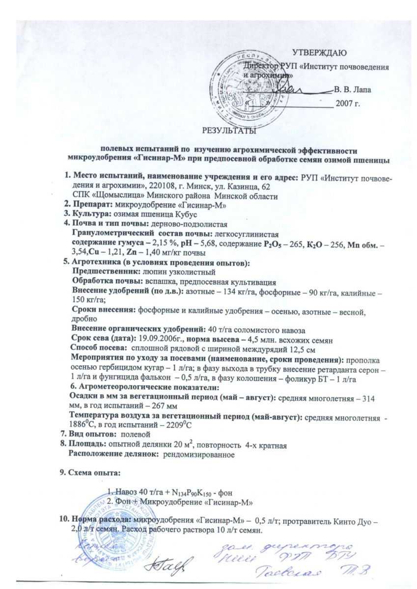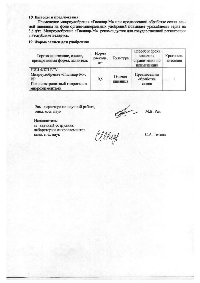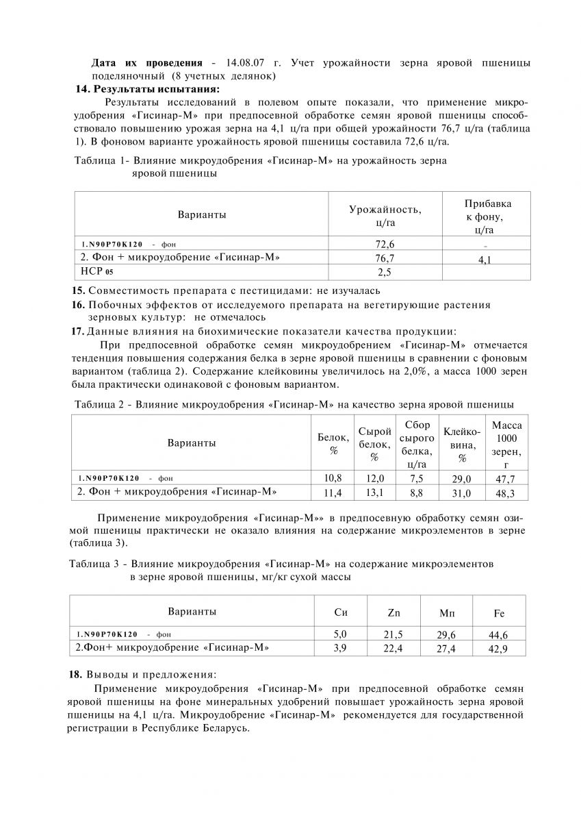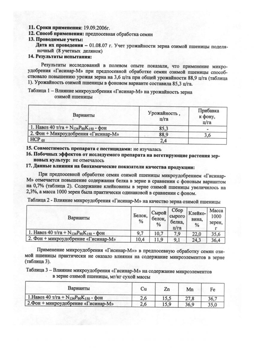 Гисинар-М при предпосевной обработке семян зерновых культур на фоне органо-минеральных и минеральных удобрений на основании результатов исследований, проведенных в РУП «Институт почвоведения и агрохимии», показало, что его использование повышает урожайность зерна озимой пшеницы на 3,6 ц/га, озимого тритикале на 4,2 ц/га, ячменя на 3,7 ц/га и яровой пшеницы на 4,1 ц/га.