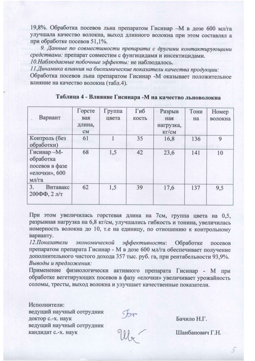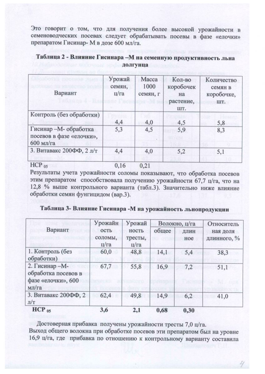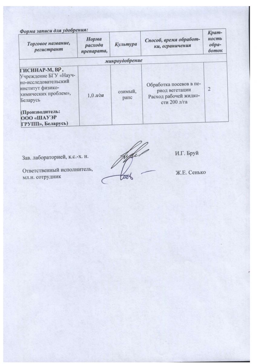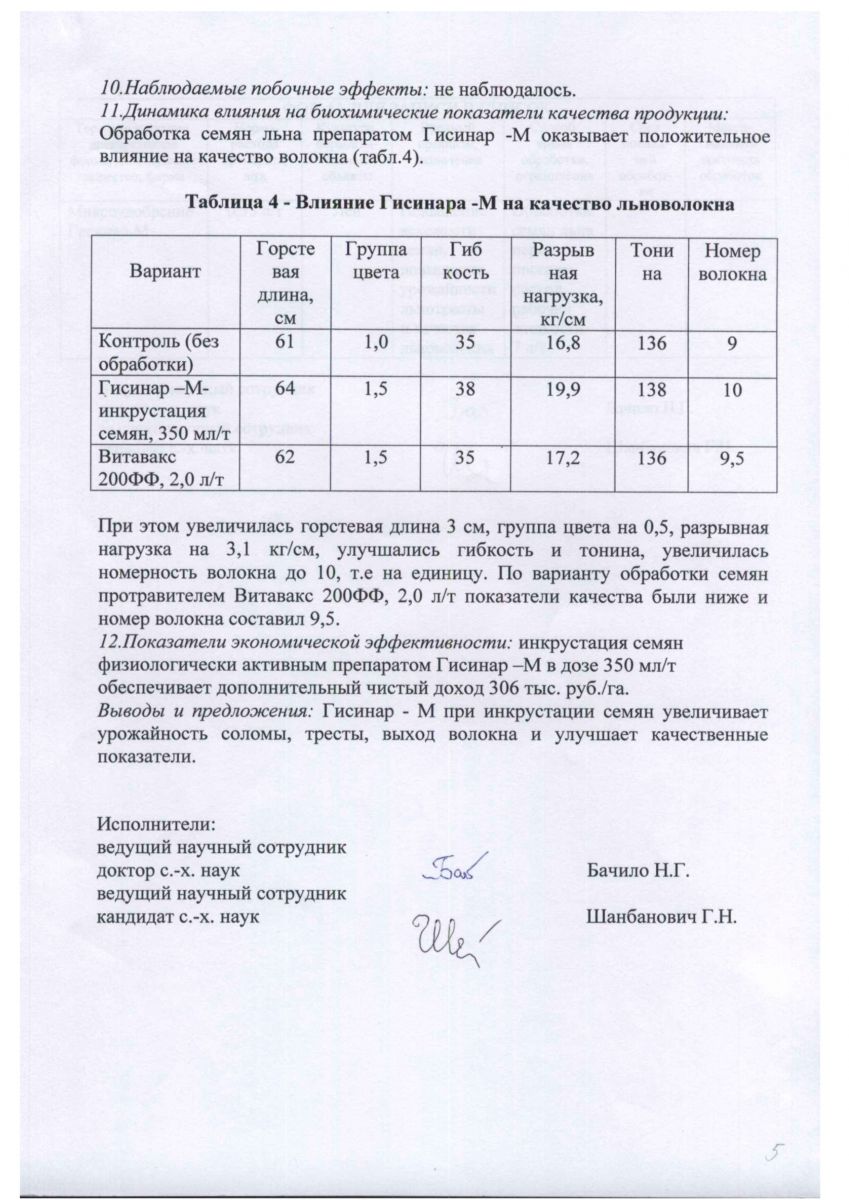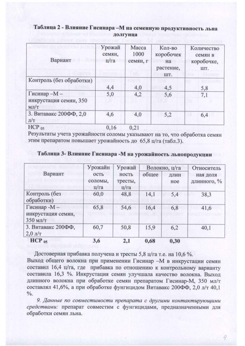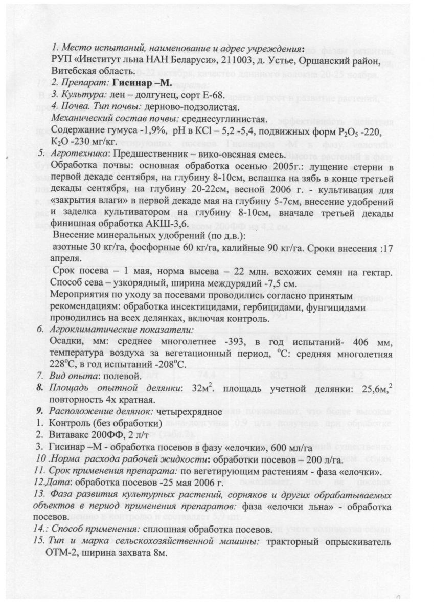 Гисинар-М при предпосевной обработке семян зерновых культур на фоне органо-минеральных и минеральных удобрений на основании результатов исследований, проведенных в РУП «Институт почвоведения и агрохимии», показало, что его использование повышает урожайность зерна озимой пшеницы на 3,6 ц/га, озимого тритикале на 4,2 ц/га, ячменя на 3,7 ц/га и яровой пшеницы на 4,1 ц/га.