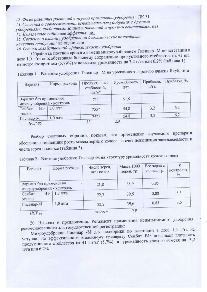Выписка из отчета биологической и хозяйственной эффективности микроудобрения Гисинар-М на яровом ячмене в 2017 году: