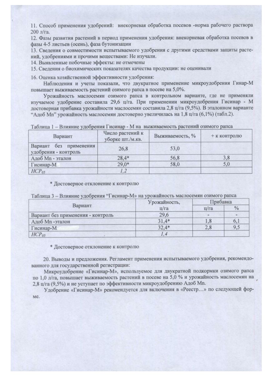 Выписка из отчета биологической и хозяйственной эффективности микроудобрения Гисинар-М на озимом рапсе в 2017 году: