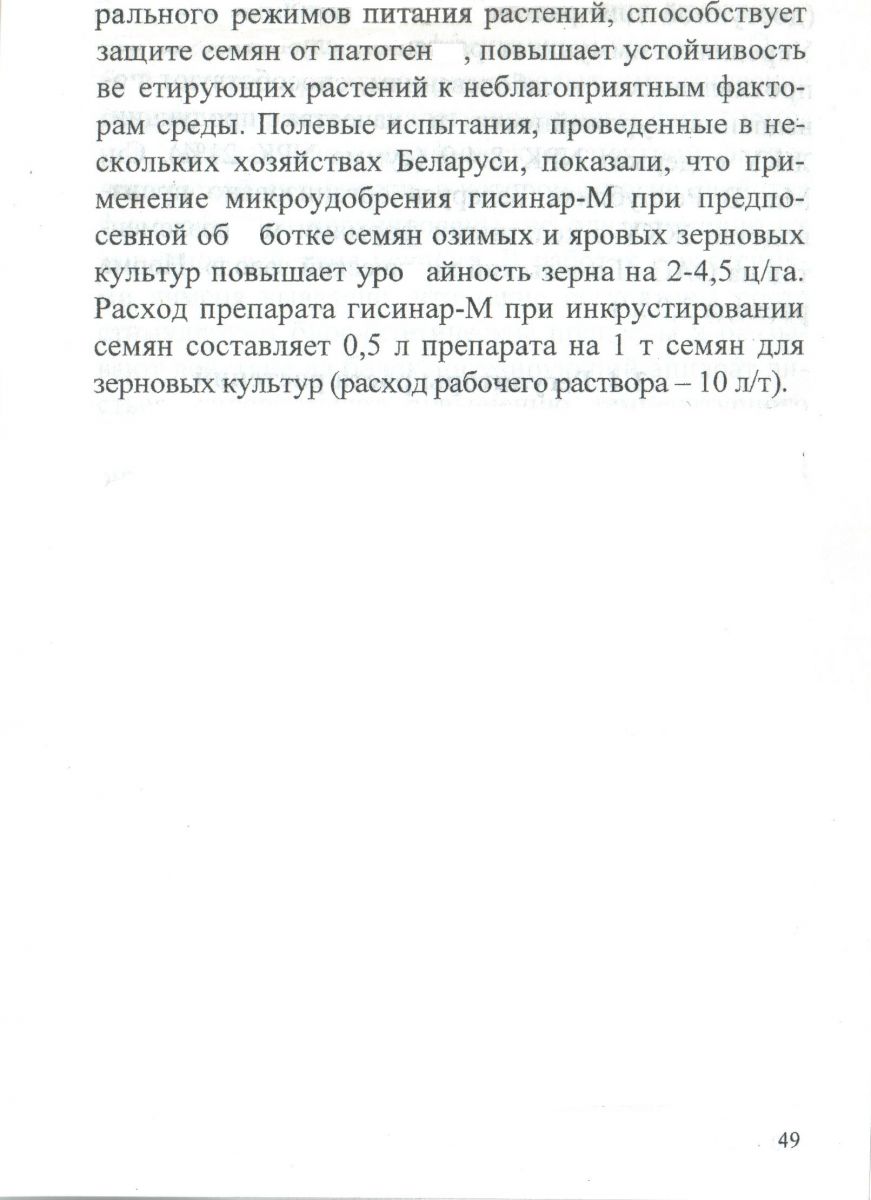 Норма расхода: все растения нуждаются в микроэлементах на протяжении всего периода вегетации, от прорастания семян до полной физиологической спелости, но более всего в начальные фазы роста и развития, в период кущения и формирования зерна. Поэтому, при достаточном уровне основного минерального питания для получения стабильно высоких урожаев с хорошими качественными показателями необходимо применять следующие приемы, эффективность которых доказана наукой и практикой: для стимулирования всхожести и энергии прорастания семян, увеличения сопротивляемости растений к вредным организмам и неблагоприятным погодным условиям в начальные фазы роста при предпосевной обработке (инкрустации) семян добавлять к протравителям Гисинар-М с нормой расхода при инкрустации семян, составляющей 0,5 л на 1 т семян для озимых и яровых зерновых культур (расход рабочего раствора - 10 л/т) и 0,35 л на 1 т семян льна (расход рабочего раствора - 7 л/т).