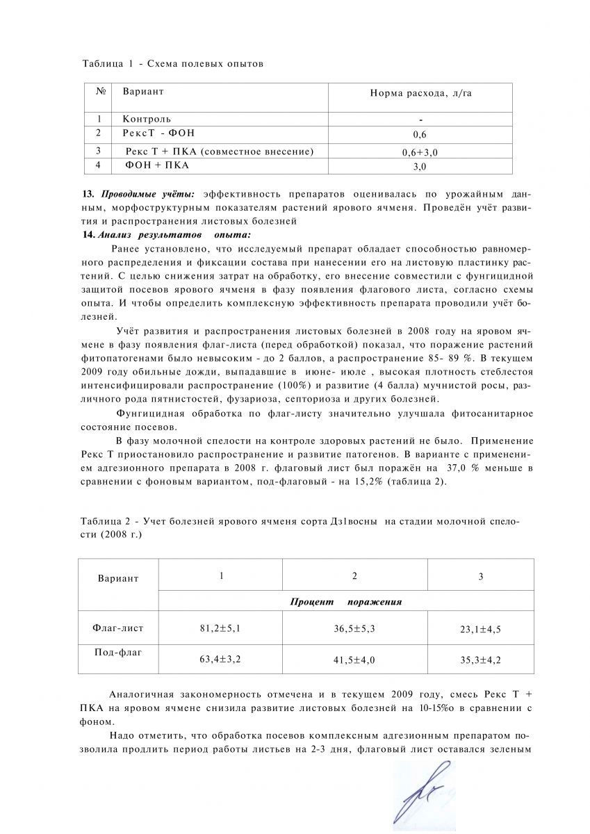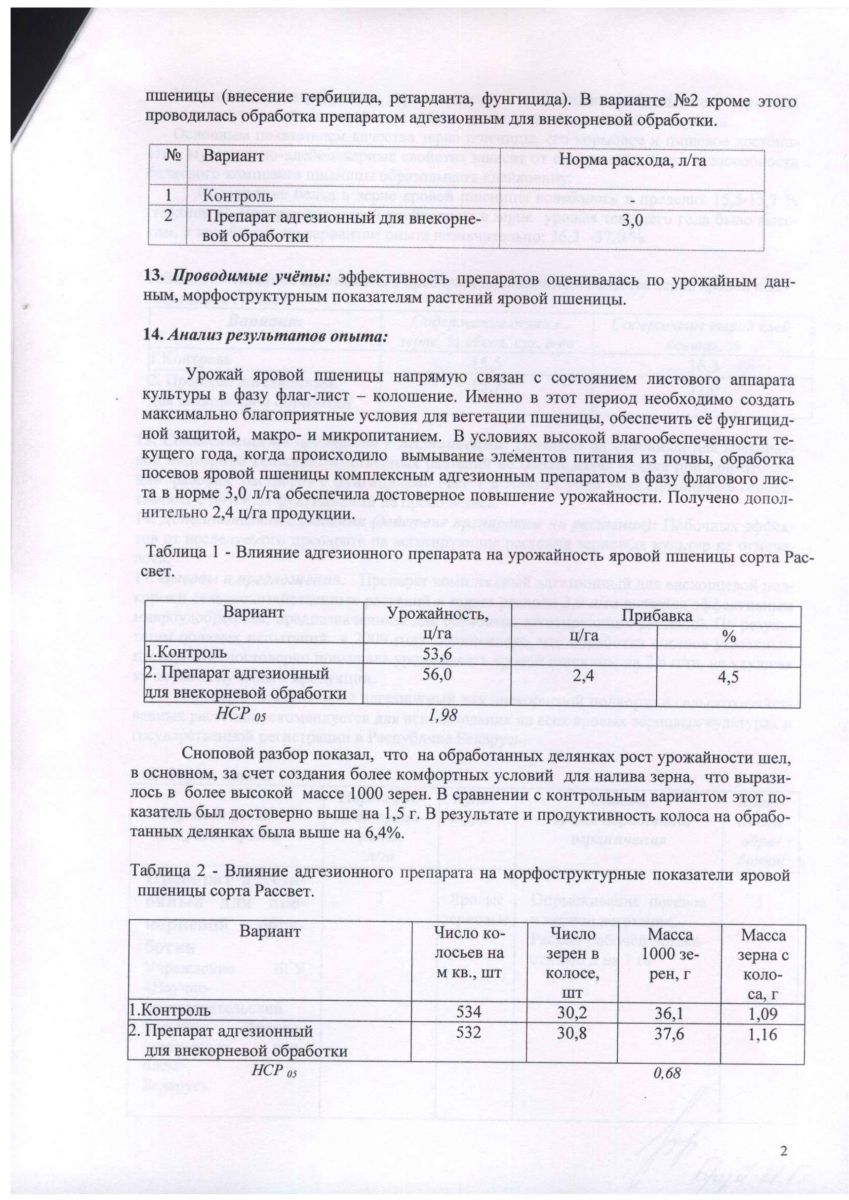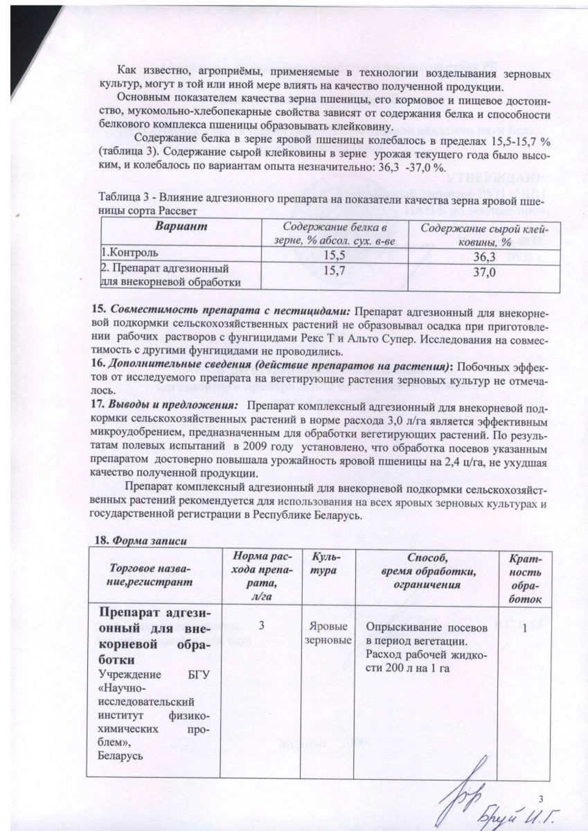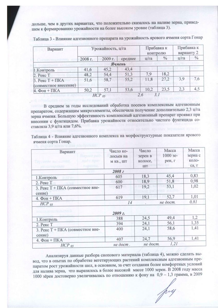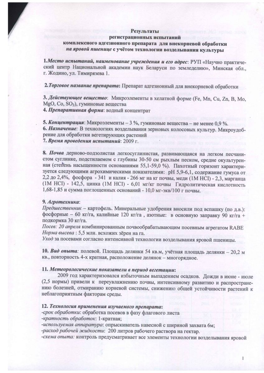 По данным РУП «Научно практический центр Национальной академии наук Беларуси по земледелию», (г. Жодино Минской обл.) использование комплексного адгезионного препарата для внекорневой подкормки сельскохозяйственных растений, при обработке вегетирующих посевов зерновых культур в фазе флаг-листа на фоне фунгицида Рекс Т, повышает урожайность зерна озимой пшеницы на 2,9 ц/га, яровой пшеницы на 2,4 ц/га, ячменя на 3,9 ц/га. Результаты полевых испытаний, проведенных в РУП «Институт льна НАН Беларуси», при подкормках посевов озимых и яровых зерновых культур адгезионным препаратом показали, что его использование по сравнению с эталоном (микроудобрения – сульфат меди и магния) дает прибавку урожая озимой пшеницы – 3,6 ц/га, озимой ржи – 2,9 ц/га, ярового ячменя – 2,0 ц/га.