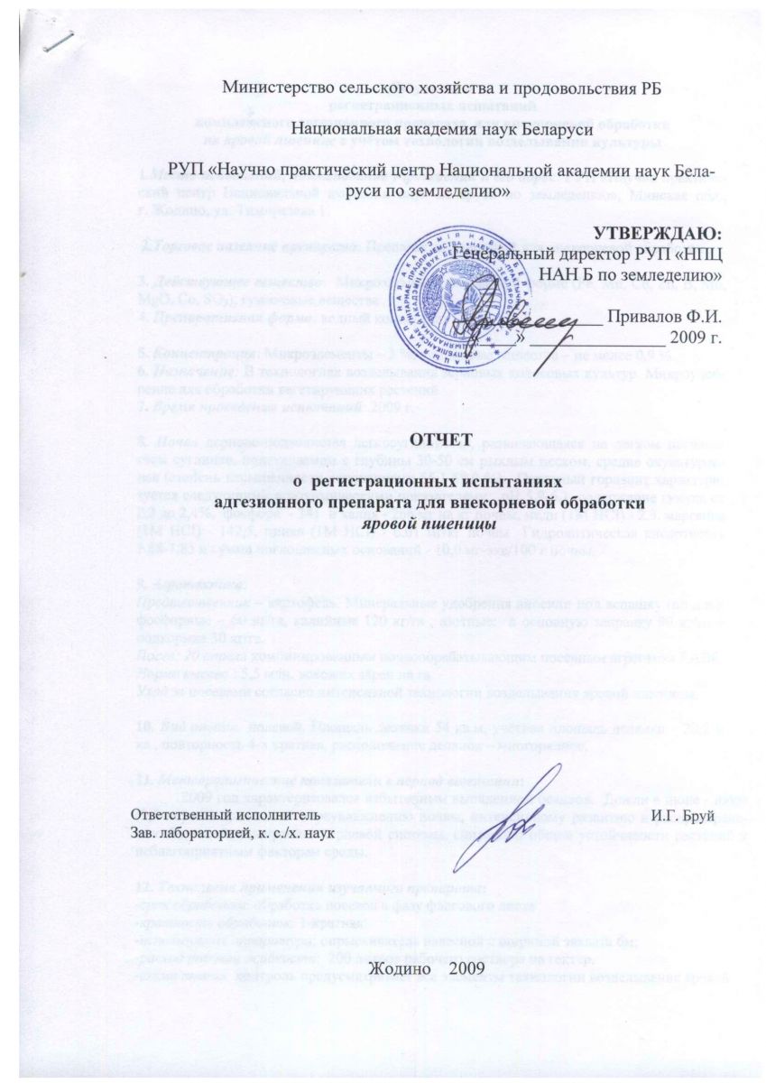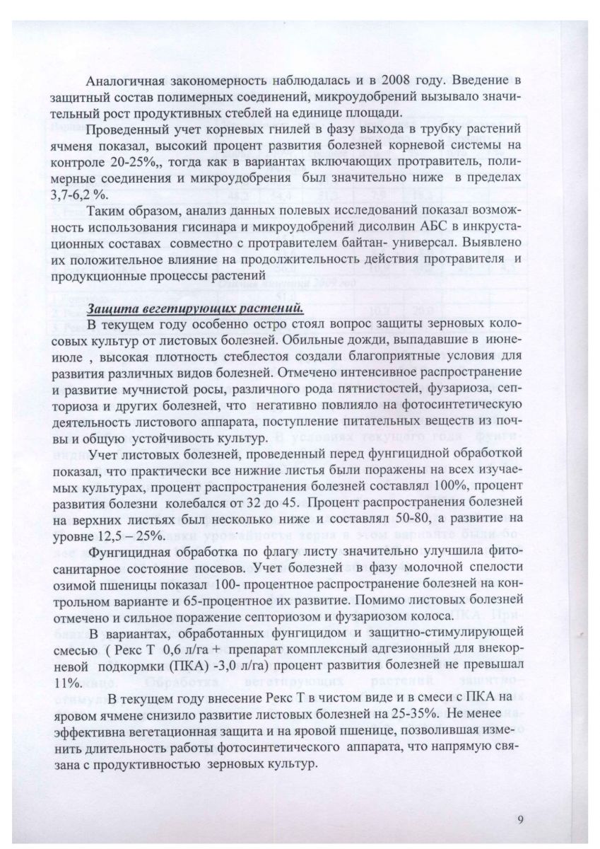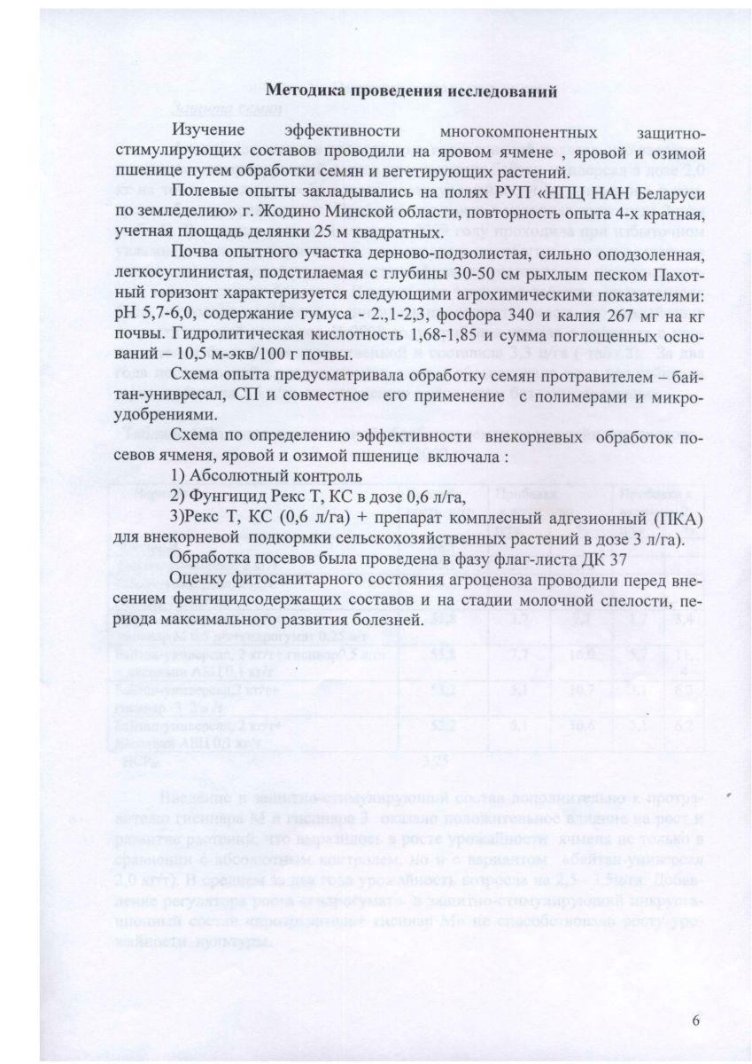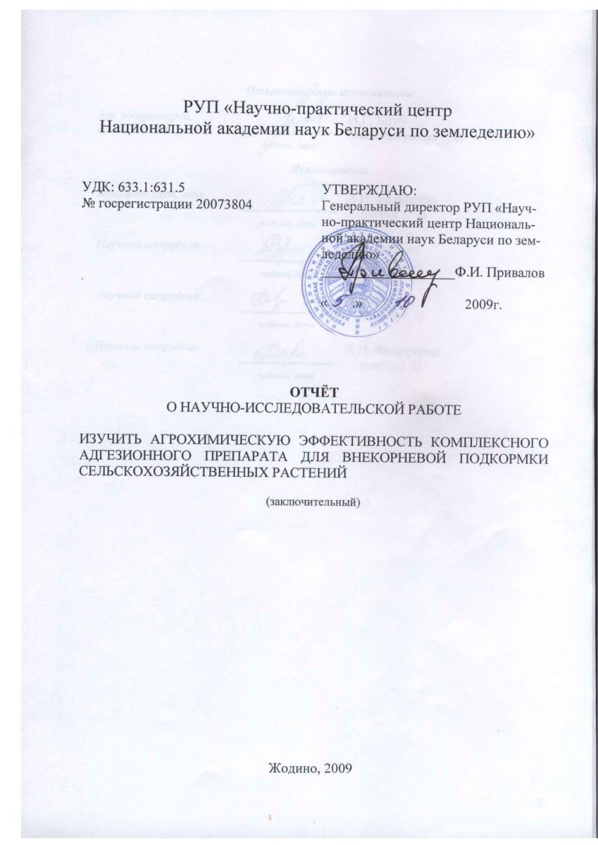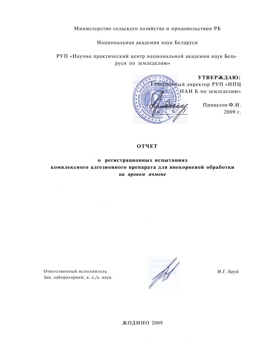 По данным РУП «Научно практический центр Национальной академии наук Беларуси по земледелию», (г. Жодино Минской обл.) использование комплексного адгезионного препарата для внекорневой подкормки сельскохозяйственных растений, при обработке вегетирующих посевов зерновых культур в фазе флаг-листа на фоне фунгицида Рекс Т, повышает урожайность зерна озимой пшеницы на 2,9 ц/га, яровой пшеницы на 2,4 ц/га, ячменя на 3,9 ц/га. Результаты полевых испытаний, проведенных в РУП «Институт льна НАН Беларуси», при подкормках посевов озимых и яровых зерновых культур адгезионным препаратом показали, что его использование по сравнению с эталоном (микроудобрения – сульфат меди и магния) дает прибавку урожая озимой пшеницы – 3,6 ц/га, озимой ржи – 2,9 ц/га, ярового ячменя – 2,0 ц/га.