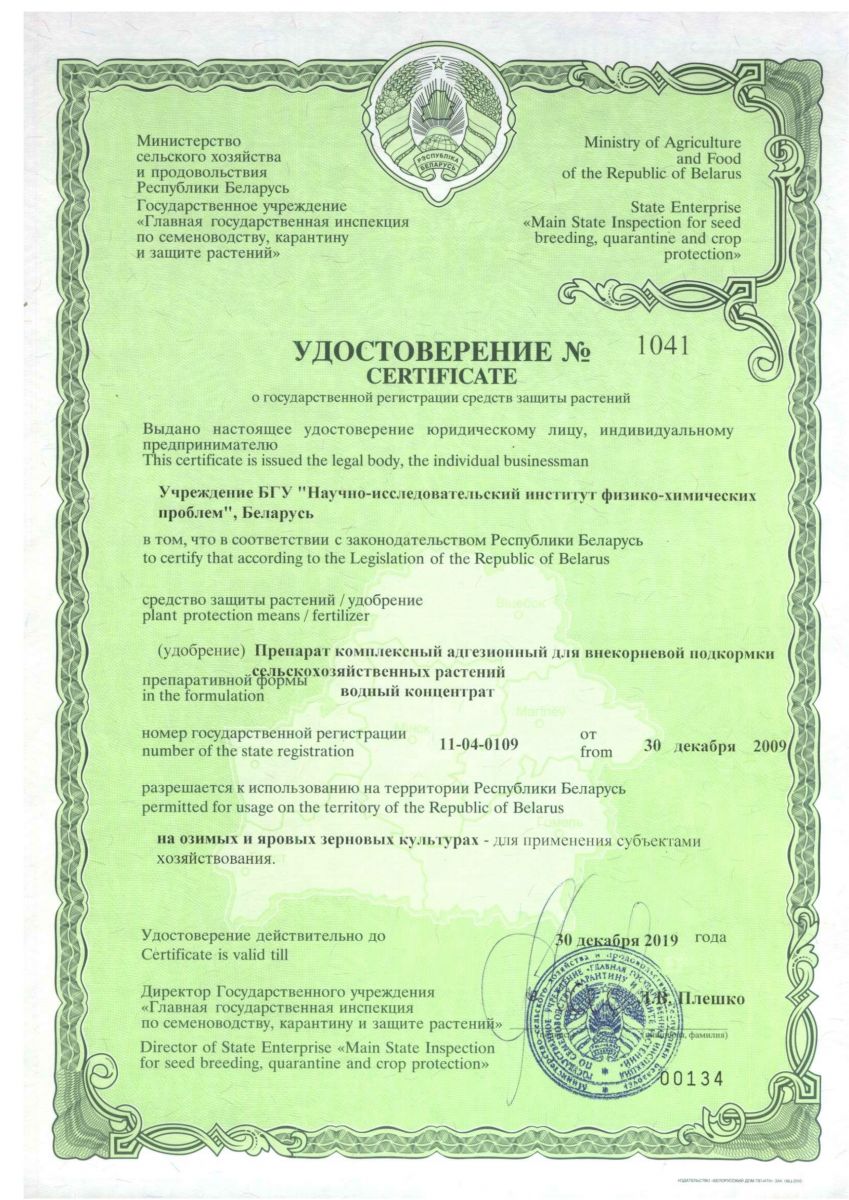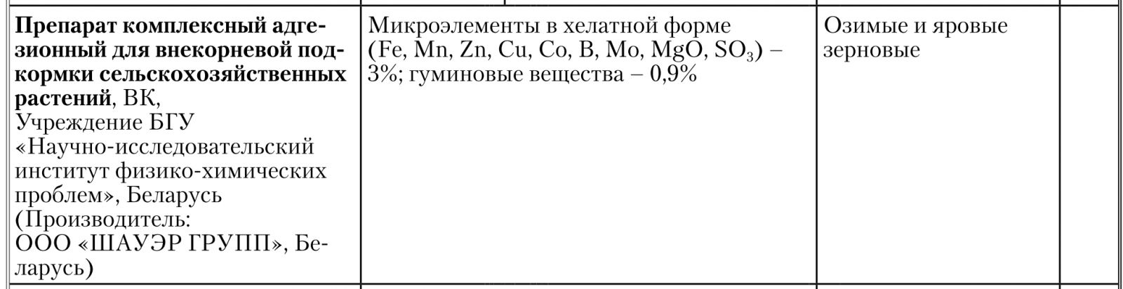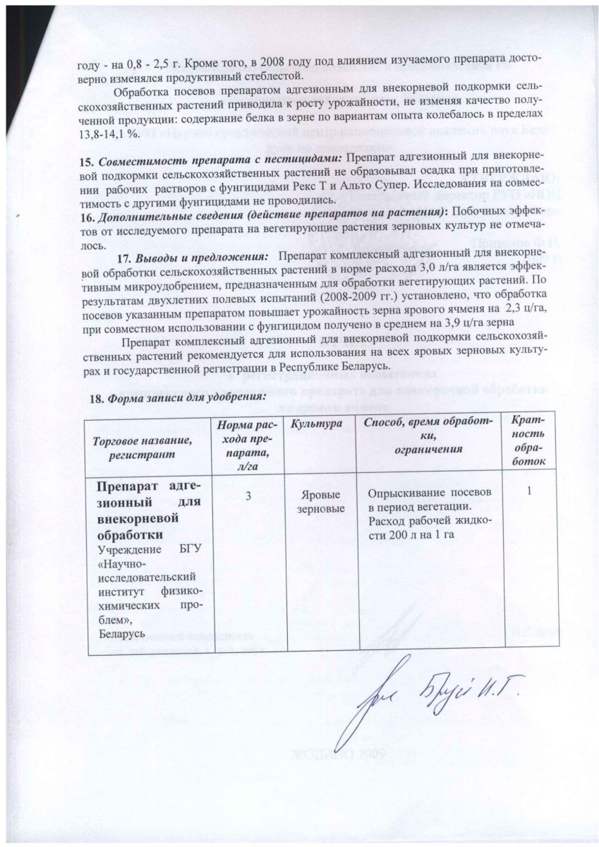 Препарат комплексный адгезионный для внекорневой подкормки сельскохозяйственных растений рекомендован для использования на всех яровых и озимых зерновых культурах, зарегистрирован с 2010 г. и внесен в государственный реестр пестицидов и удобрений, разрешенных для применения на территории Республики Беларусь. Внекорневая подкормка осуществляется на стационарном, серийно выпускаемом оборудовании.