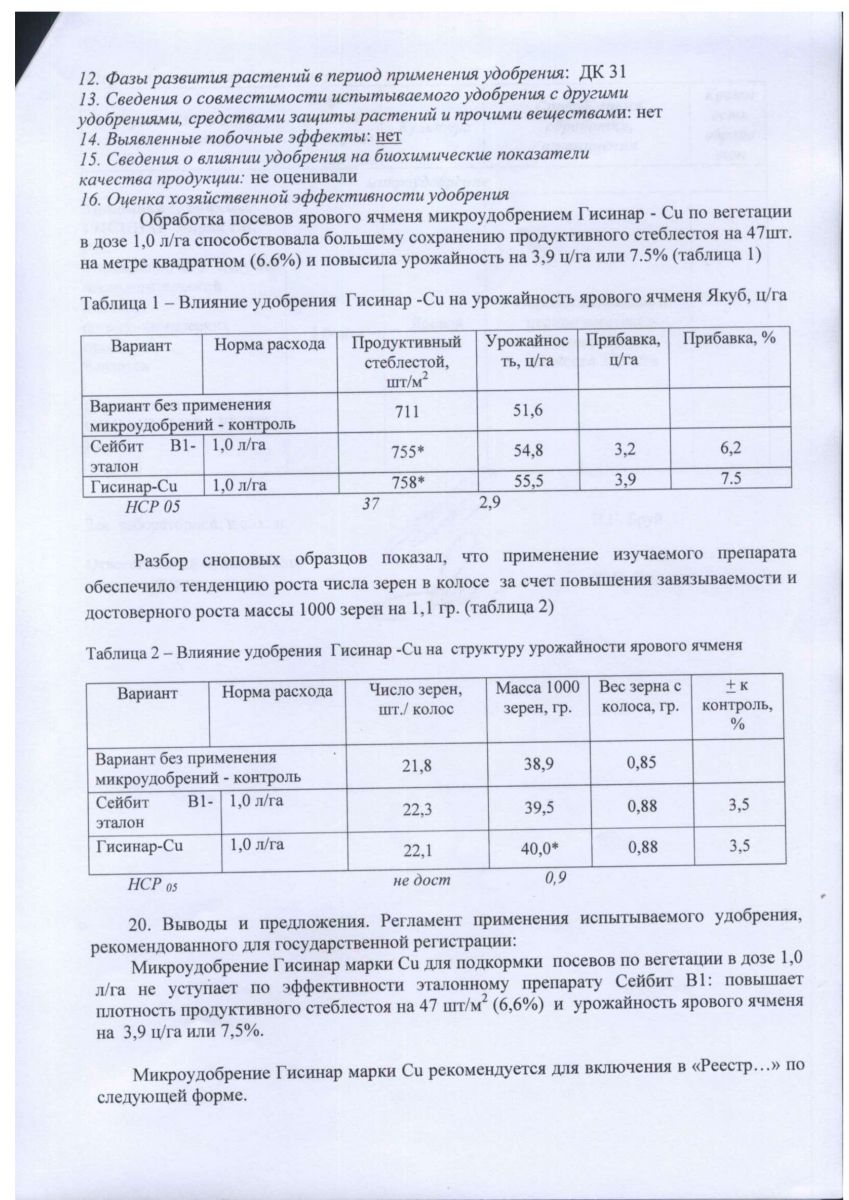 Выписка из отчета биологической и хозяйственной эффективности микроудобрения Гисинар-Cu на яровом ячмене в 2017 году:
