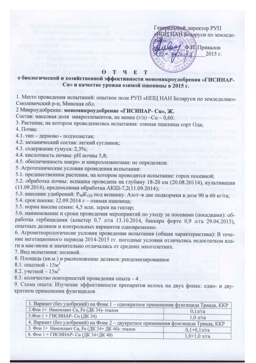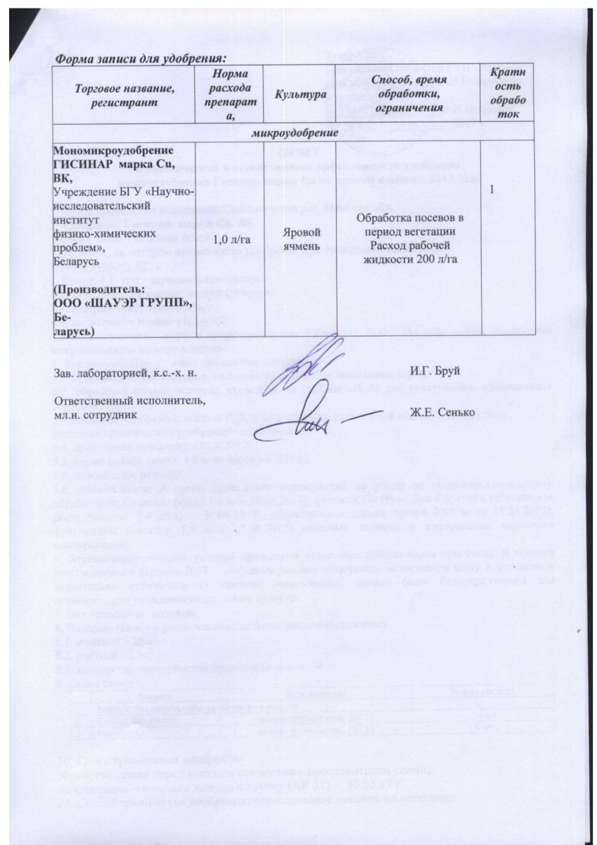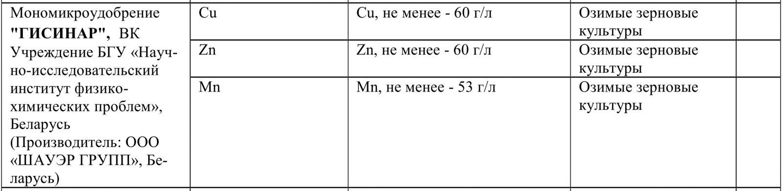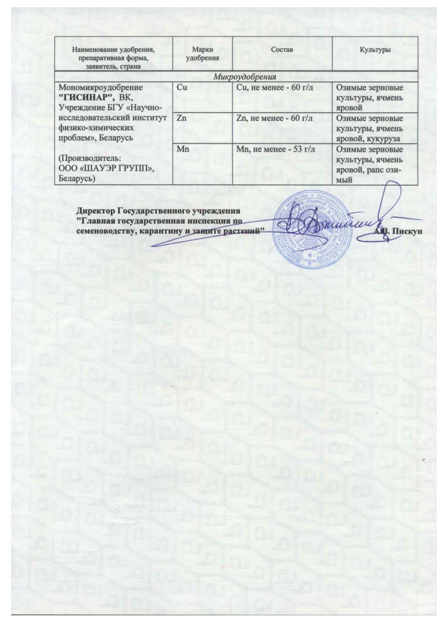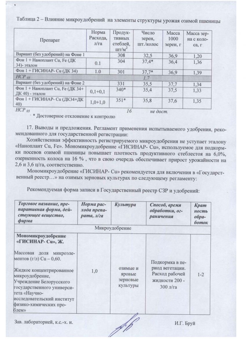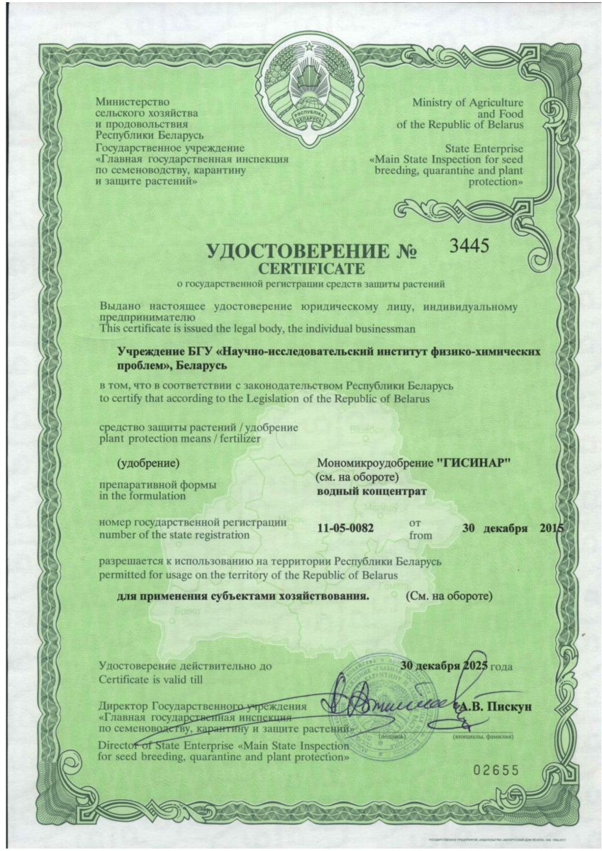 В связи с полученными результатами мономикроудобрение Гисинар-Cu прошло государственную регистрацию и внесено в в «Государственный реестр средств защиты растений (пестицидов) и удобрений, разрешенных к применению на территории Республике Беларусь».