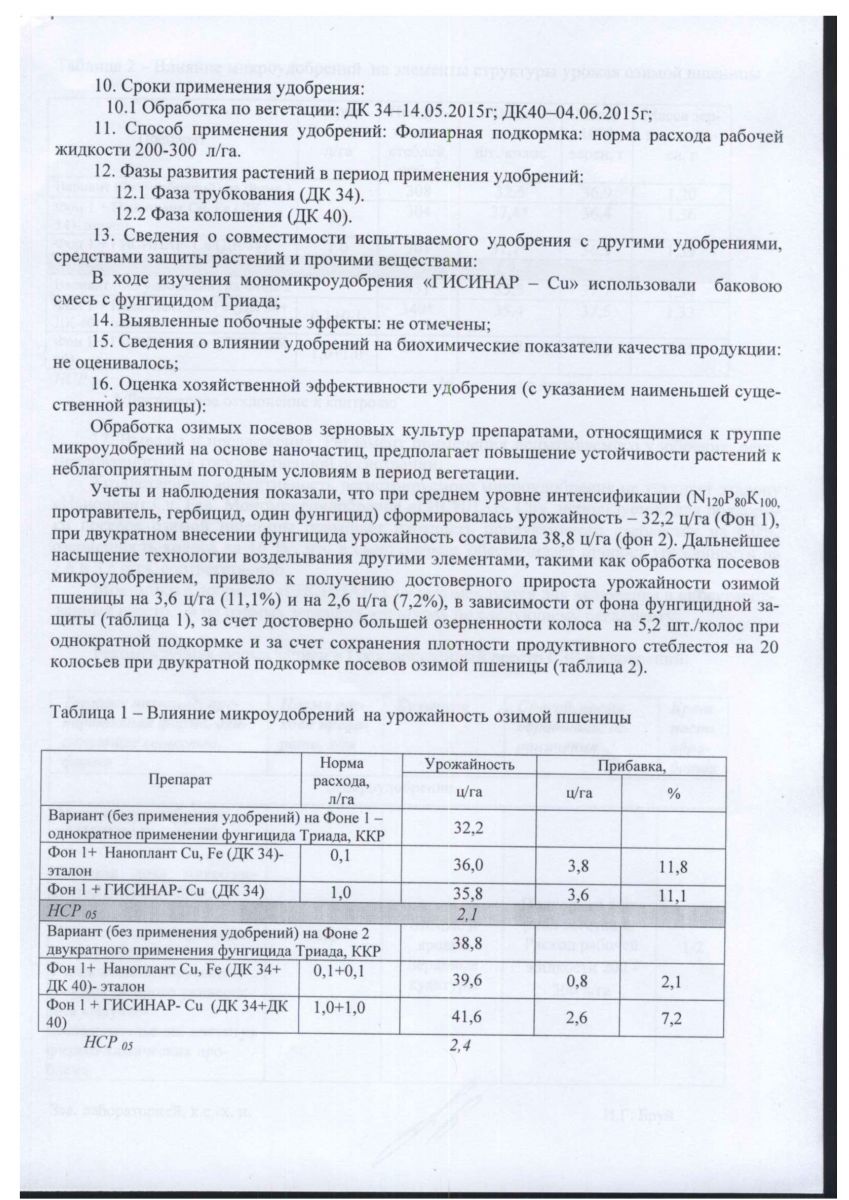 По данным изучения агрохимической эффективности мономикроудобрения Гисинар-Cu при обработке вегетирующих посевов озимых зерновых культур в фазе трубкования-колошения на фоне фунгицида Триада, проведенного РУП «Научно практический центр Национальной академии наук Беларуси по земледелию», (Смолевичский р-н, Минская обл.) показано, что применение мономикроудобрения Гисинар-Cu повышает урожайность зерна озимой пшеницы на 3,6 ц/га.